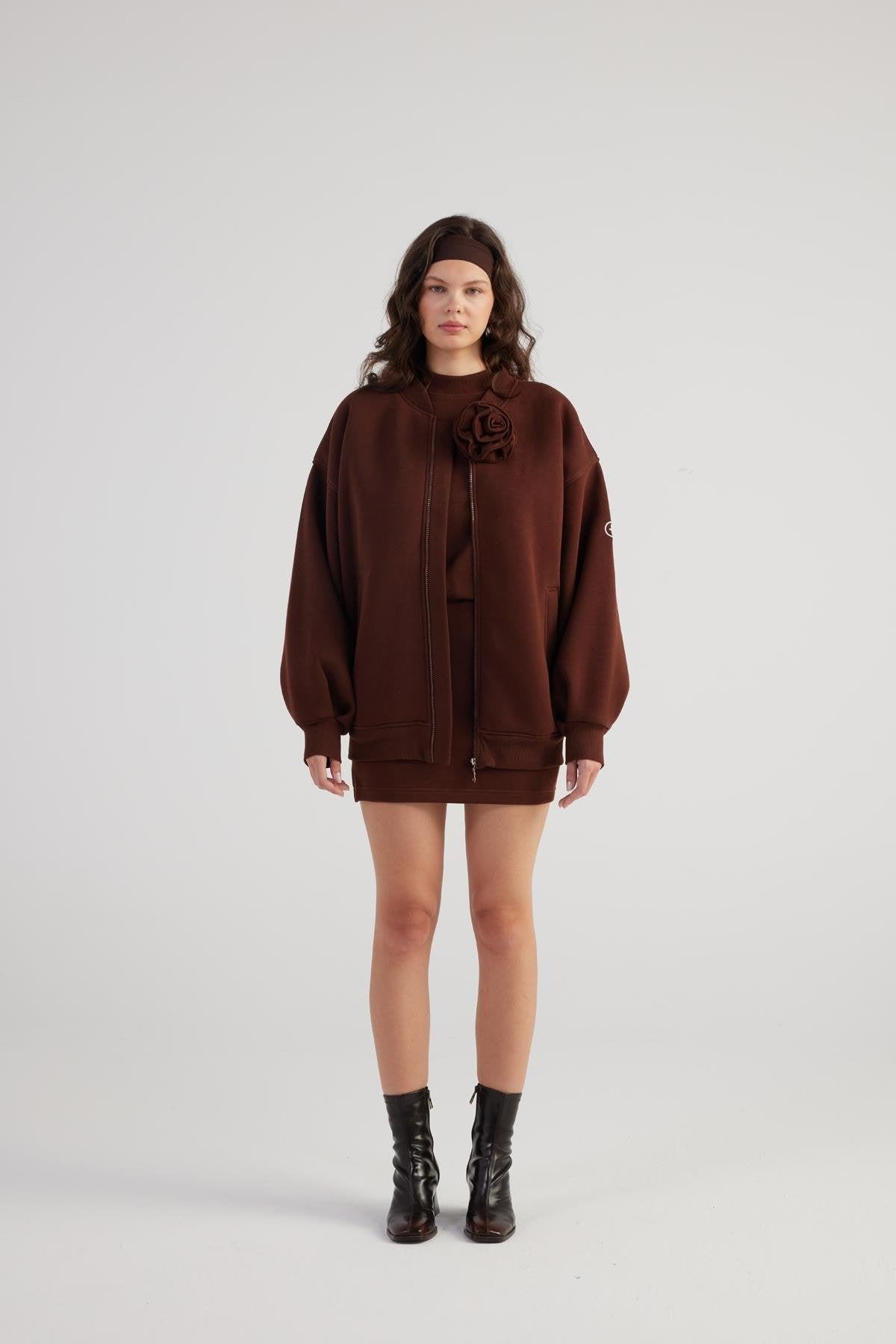 Alexa Brown Oversize Bomber Jacket with Removable Rose Accessory