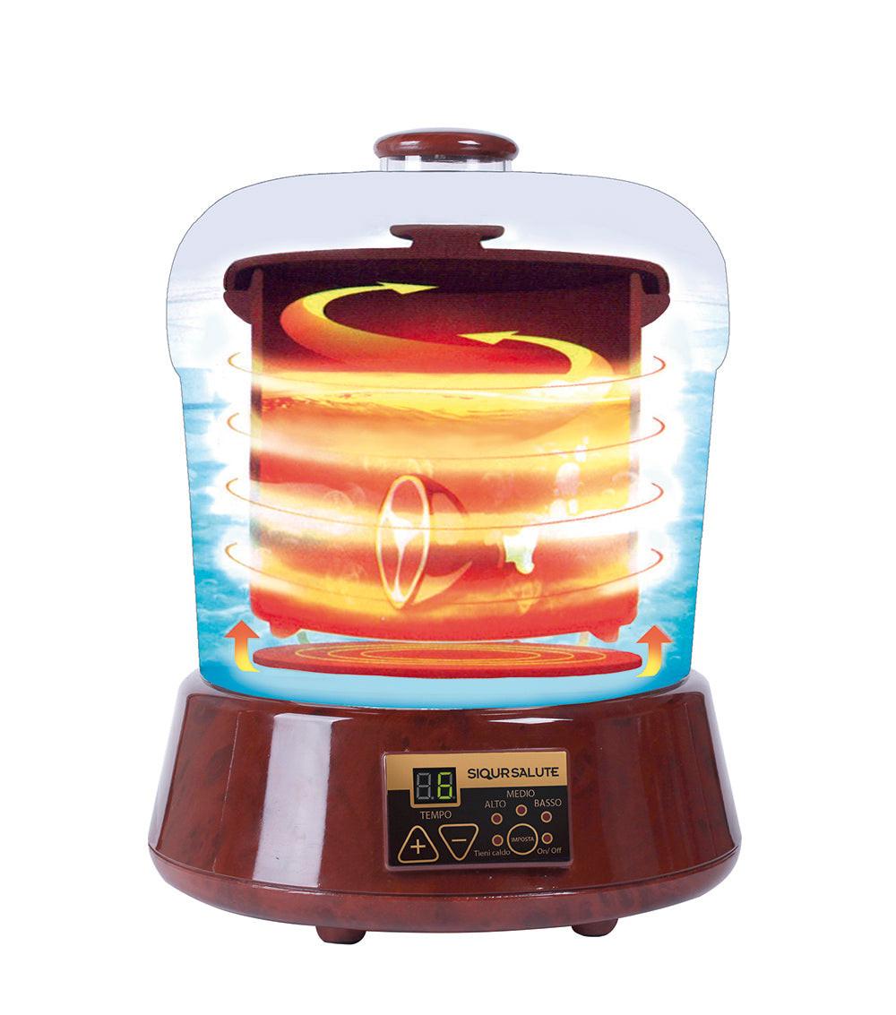The automatic stew cooking system is based on traditional oriental cooking, changing it with modern ones electronic technologies. Slow cooking can have therapeutic effects: food is cooked for a long time and at a low temperature, gently, in an airtight container. The automatic pot works without ever exceeding 100 ° C, compared to 120 ° - 150 ° - 200 ° and beyond that characterize other types of cooking (such as frying, grilling and grilling, in a pan, in the oven), to keep the nutritional properties of food to the maximum. Cooking takes place indirectly, in a bain-marie: the water contained in the container reaches boiling and it transmits heat in a gentle, constant and uniform way to the ceramic pot inside. Natural stews are obtained, tasty and soft, without the fibers and cellulose being broken. It is ideal for all those foods that can spoil themselves by intense heat, such as sauces, puddings, bechamel, sweet creams, recipes containing eggs, cheese fondues that tend to thicken ... also excellent for stewed meat, soups, marrowbones, purees, vegetables, legumes, fish and shellfish, soups, mushrooms.