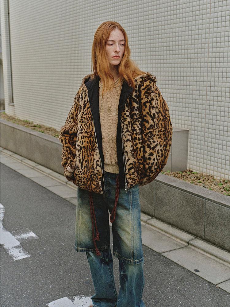 "Leopard Fantasy" Leopard Spot Print Reversible Drop Shoulder Hooded Custom Rabbit Fur Coat