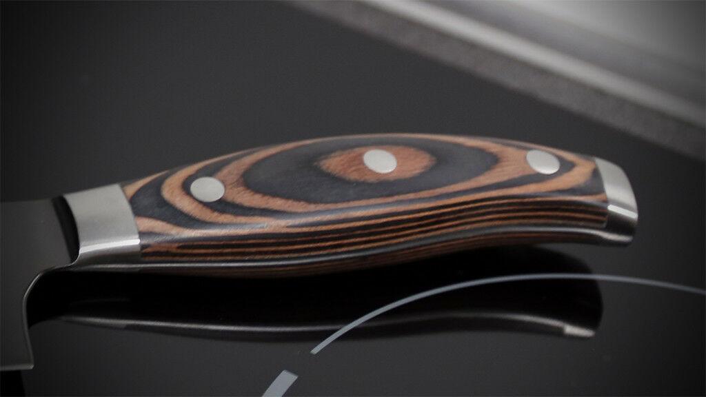 Die Klinge des Santoku-Messers ist aus einer fortschrittlichen Kombination von Titan und rostfreiem Stahl gefertigt. Diese Materialien sind nicht nur extrem hart und korrosionsbeständig, sondern auch überraschend leicht, was das Messer ideal für langes, ermüdungsfreies Arbeiten macht. Die Titanbeschichtung garantiert eine lang anhaltende Schärfe und außergewöhnliche Haltbarkeit.